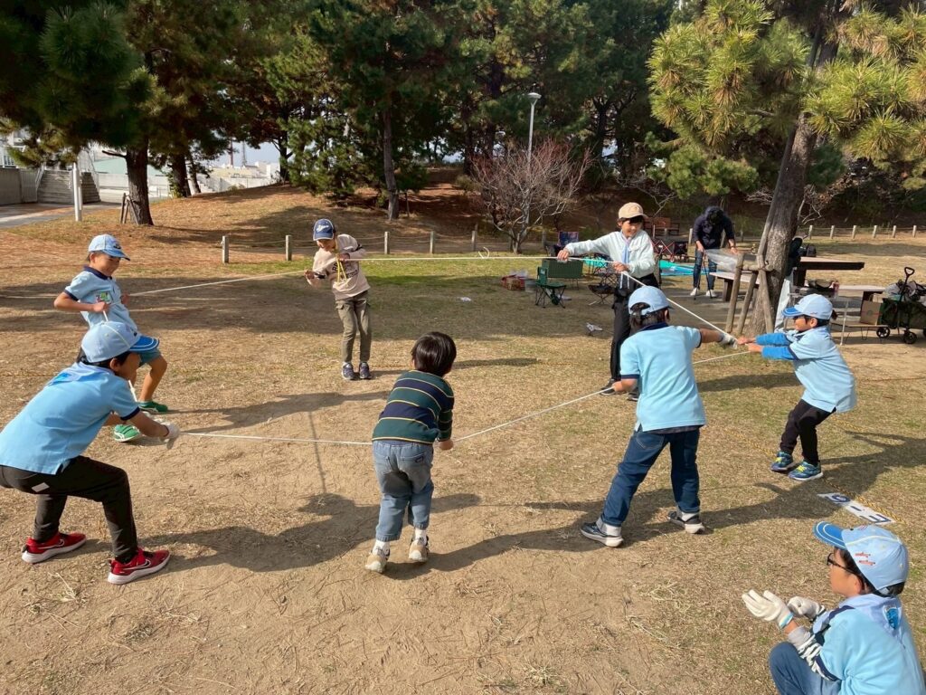 輪っかの綱引き(足が動いたら負け)や、普通の綱引きをしたり、大縄を飛んだり、ロープ一つで目一杯遊んでいました。