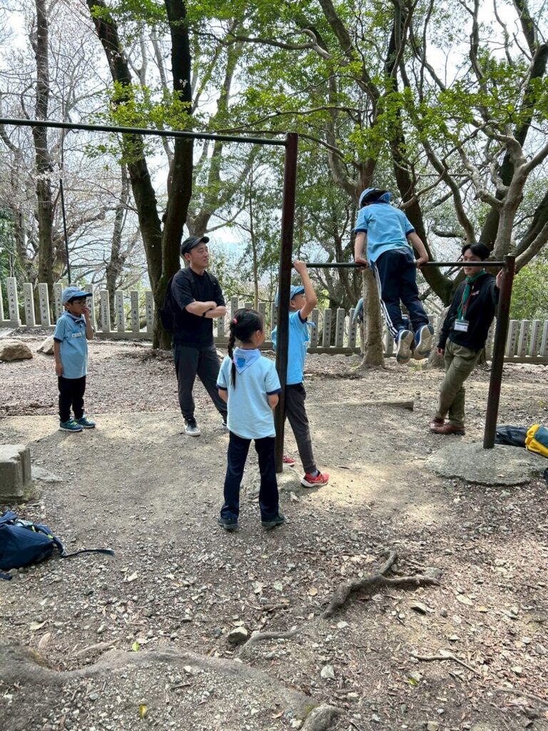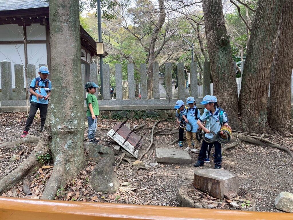 食べた後はまたみんなでおにごっこをしたり、神社の輪投げや鉄棒で遊び、岡本駅から電車で帰りました